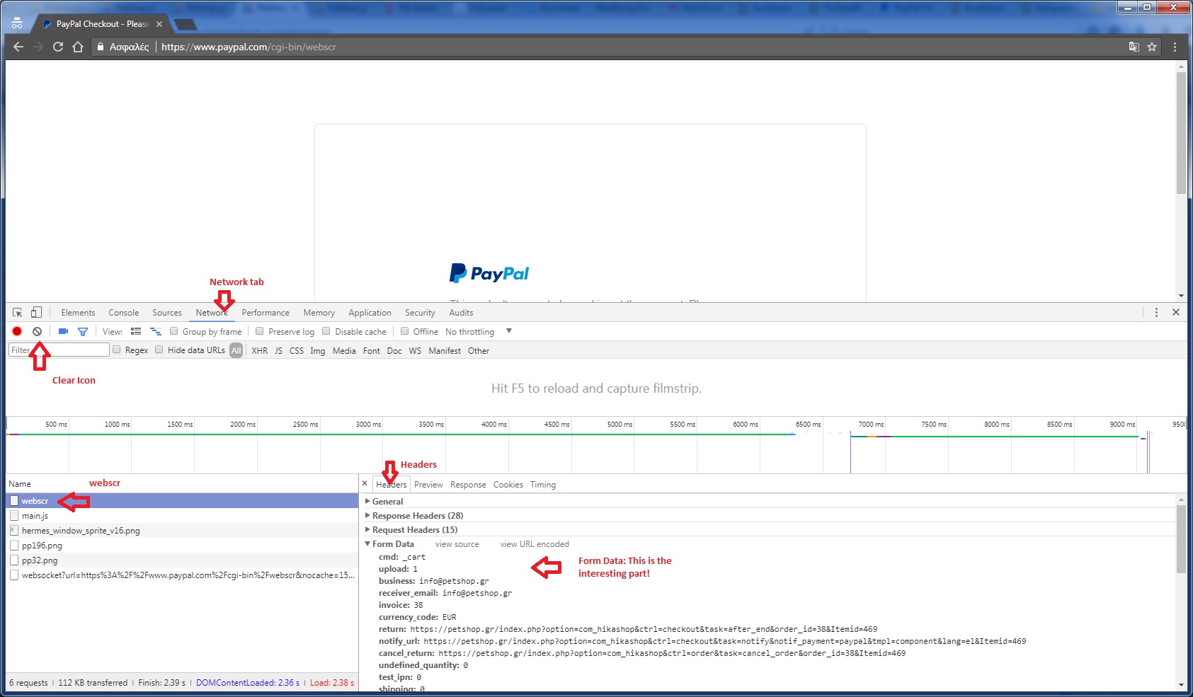 From the results of the Network tab look for the webscr and click on it. At the right you will see information about this file.