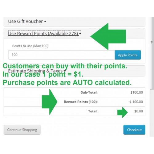 I've followed the User Point setup and I have the Point Plugin working. Upon trying it I noticed that the customer doesn't get to choose the amount of points they want to use (it seems to be predetermined by a min/max amount in the config). Is there any way to change this from radio buttons (yes/no) and instead have a input field amount? This is similar to how Opencart "Reward Points" are applied (see attached pic).