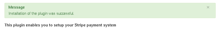 At the end of the installation a success message reports the stripe plugin was installed correctly.