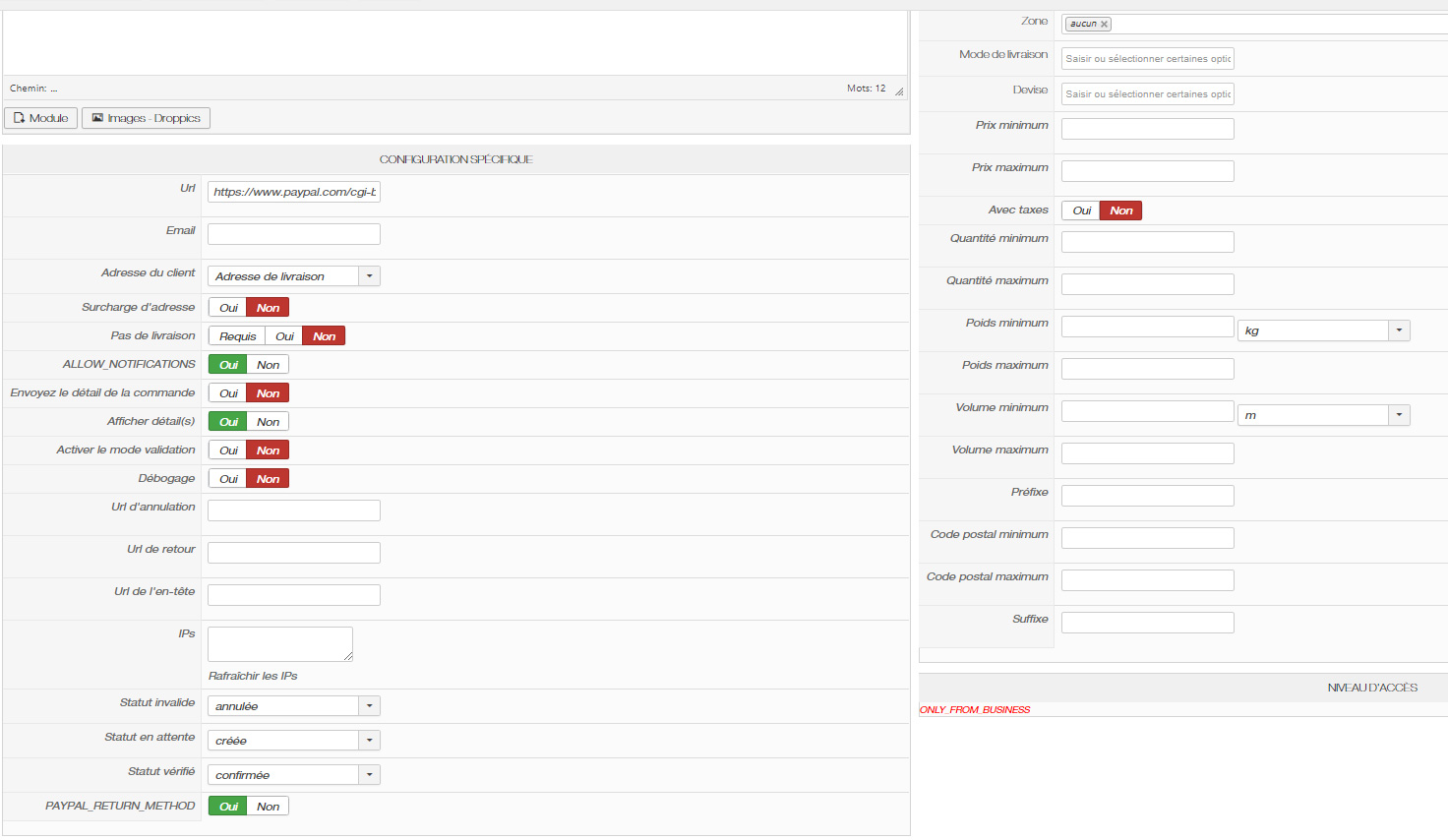 Ah oui, il faut mettre l'adresse email d'un vrai compte PayPal dans les options de la méthode de paiement, sinon cela ne peut pas fonctionner. Aussi, il est préférable de passer le compte en "Business":