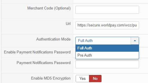 There is no "Full Auth" and "Pre Auth" in the WorldPay Business gateway plugin in Hikashop as far as I can see.