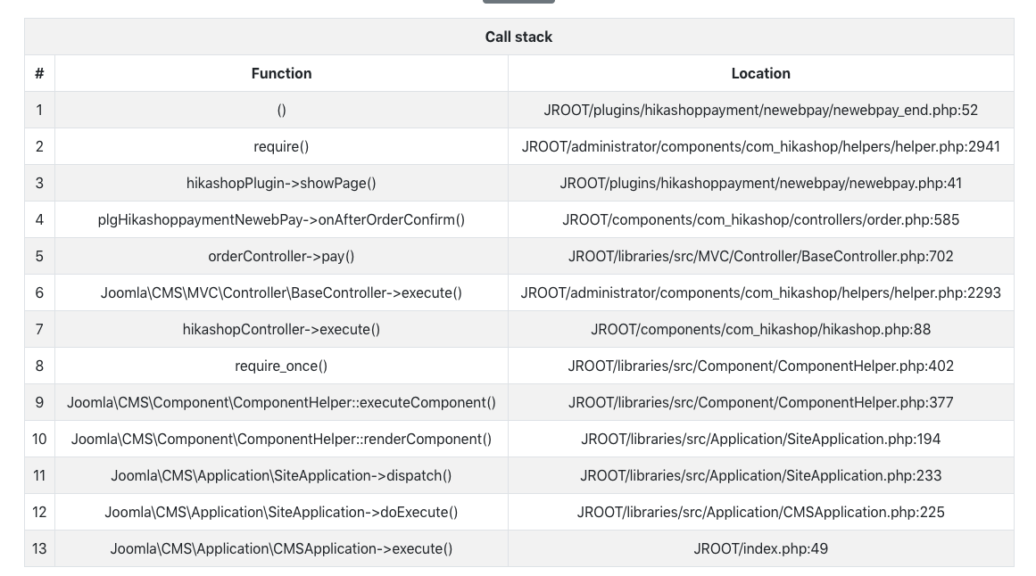 So the first thing to do is to report the error message along with the callstack screenshot you made to Newebpay support.
