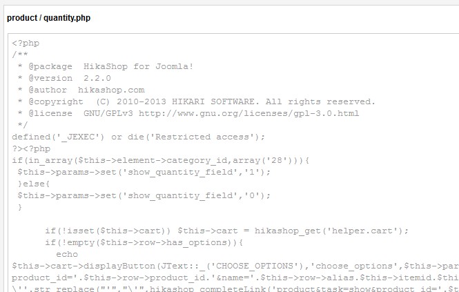 if(in_array( (int)$this->row->product_category, array(28)) ) {After that, if it don't work, you can add some "debug traces" in order to check where the code go.