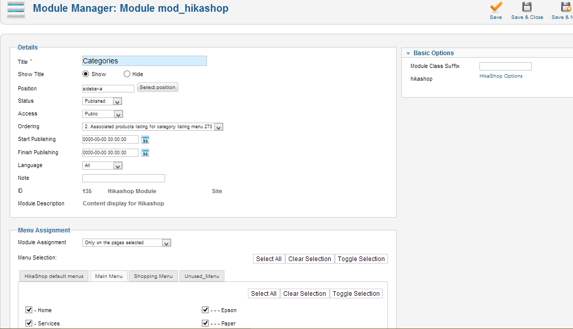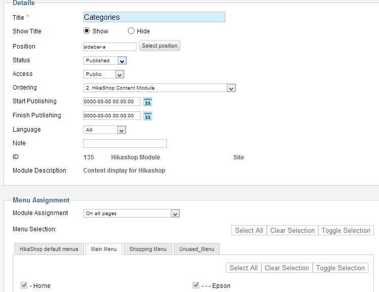 I'm using a HikaShop Content Module in a sidebar, in order to give a categories listing (i.e. a side menu). This works fine at the top level, however, upon navigating down to a sub-category or product, the content module disappears.