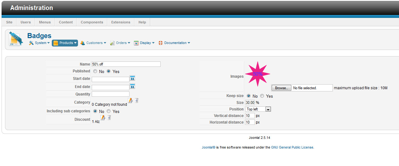 Hello, I set up a badge on a sample product and cannot get it to show up. Ultimately I need it to show up on the category listing next to the name of the product for a discounted item. Loaded a gif file with my badge and that is showing up fine. Also the discount prices are showing and work fine. "Display Badge" is set to 'yes' in System->Display parameters. Also checked "display badge" on menu item for catagory.
