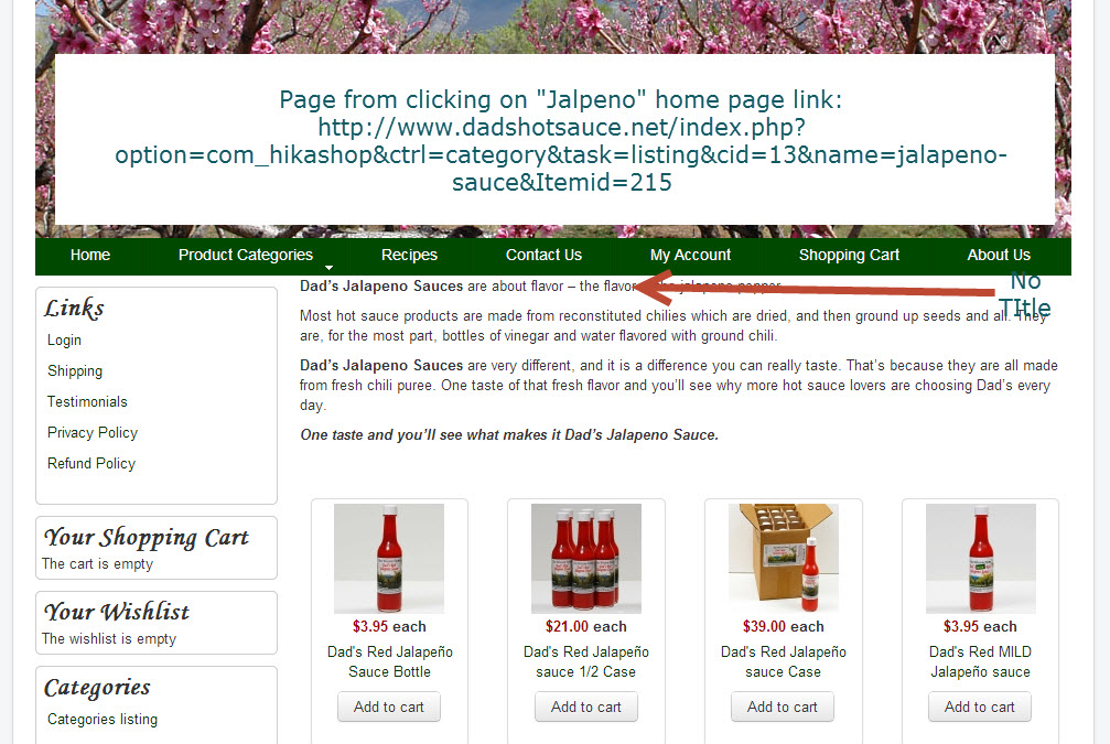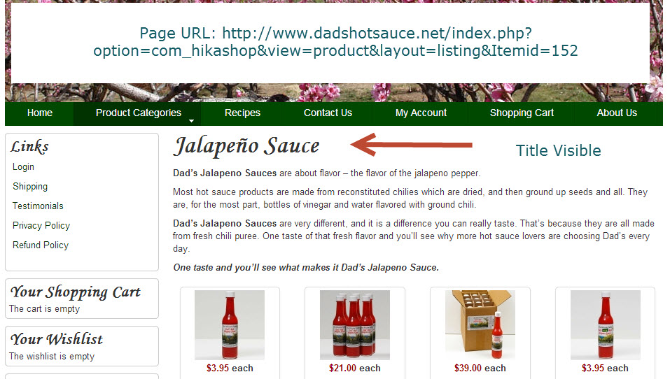 Incidentally, I changed the way I built the home page because the Intro text for the page wasn't working well with the way Hikashop displays category descriptions. Having a description on the topmost category would make the same message display on the shopping cart and other places, where it looked silly.QUestion: Why am I not able to simply switch the title of the jalapeño category on and off from the same place where I can choose to display or not the description of the category. A simple switch would have saved me hours today.