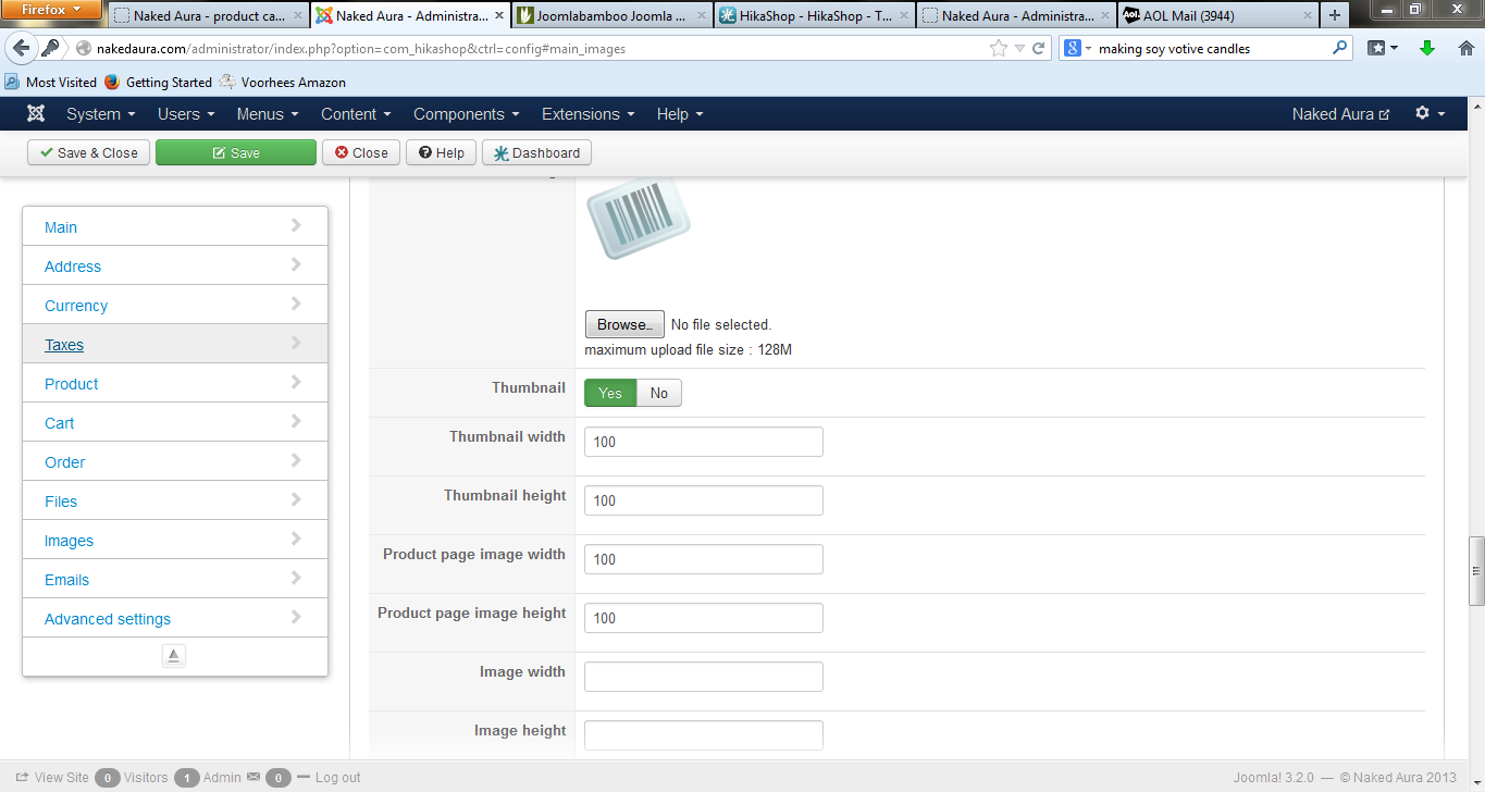 If you look at the image that is uploaded, for example nakedaura.com/media/com_hikashop/upload/...e_tin_1247252544.jpg , you can see that its size is small. So there are only two possible explanations, either you uploaded yourself that small image, or it was resized automatically during the upload because these two options were set. There is no other way as all the thumbnails which are created are stored in sub folders starting with "thumbnail" in their name.