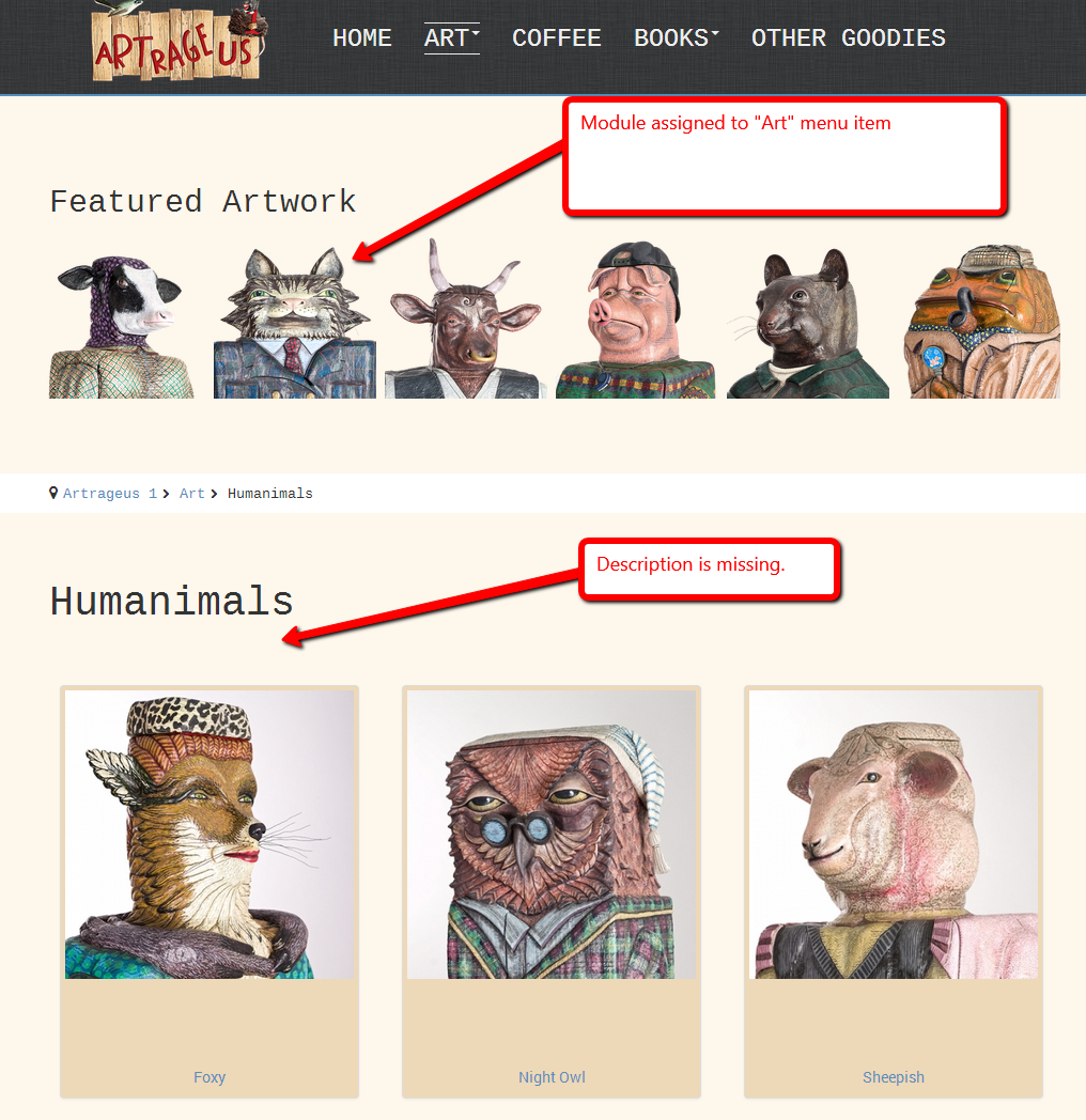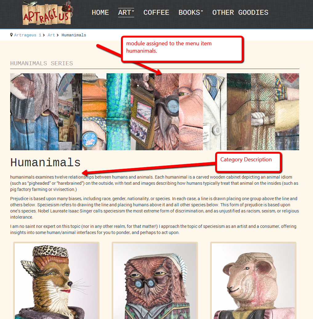 The problem happens when you click on the menu item "Art" and then click on the category image for Humanimals. What happens is that the category description does not update to the Humanimals category description; instead, it still shows the "Portfolios" category description. Additionally, when you click on the category image Humanimals on the "Art" page the page loads the module assigned to the "Art" menu item instead of the module assigned to the "Humanimals" menu item.