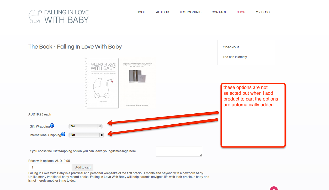 however now when you go to shop and select the product without the options and proceed to checkout it is automatically adding options to product even though they are not checked. I also cannot delete product from cart