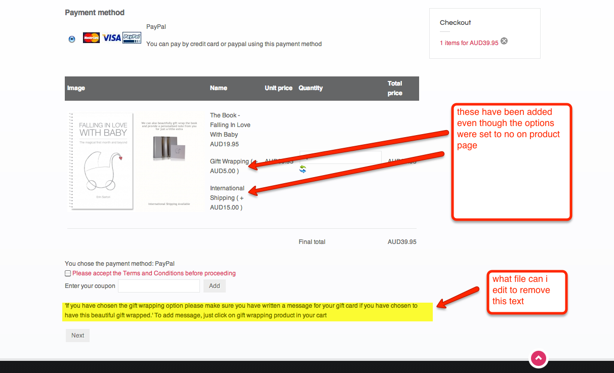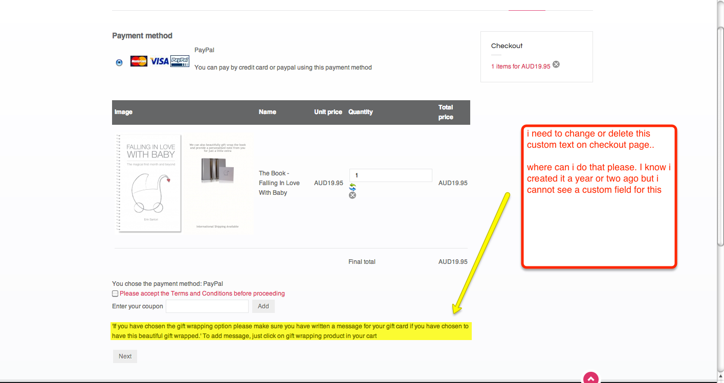Also one other issue, i created some custom text a while ago on checkout page but for the life of me i cannot remember where to edit it.. i don't seem to have a custom field for there. Any ideas? ( see pic)