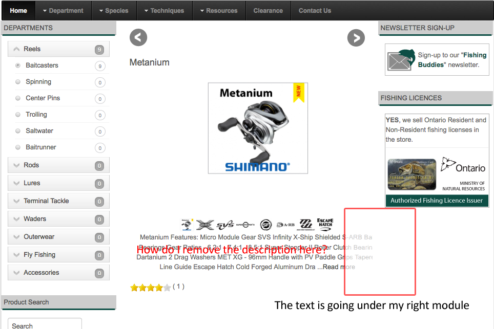 See attached. How do I remove the product description all together? Could not find any options in config>display....