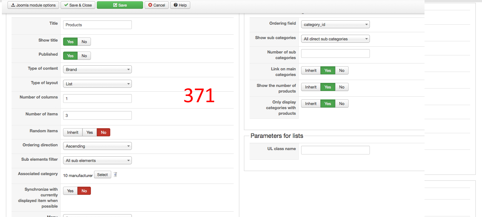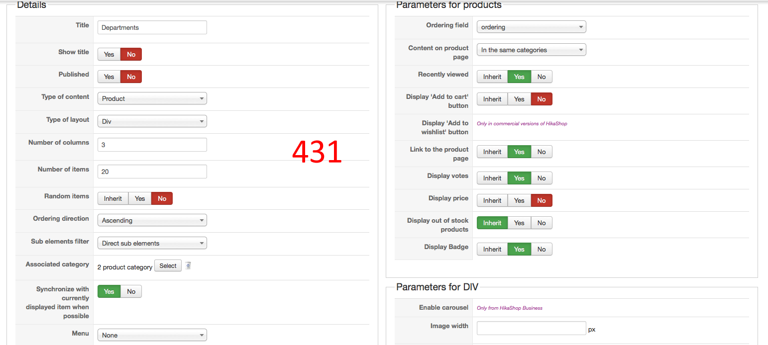 Can you also attach some screenshots of how did you configured your product listing content module which have the ID number 431 through the page "Hikashop->Display->Content module" ?