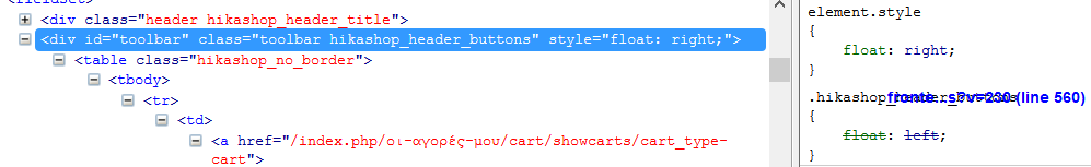 I have checked with firebug and it is ".hikashop_header_buttons" found at "frontend_custom.css?v=230". At that file I change to float:left but nothing changes.