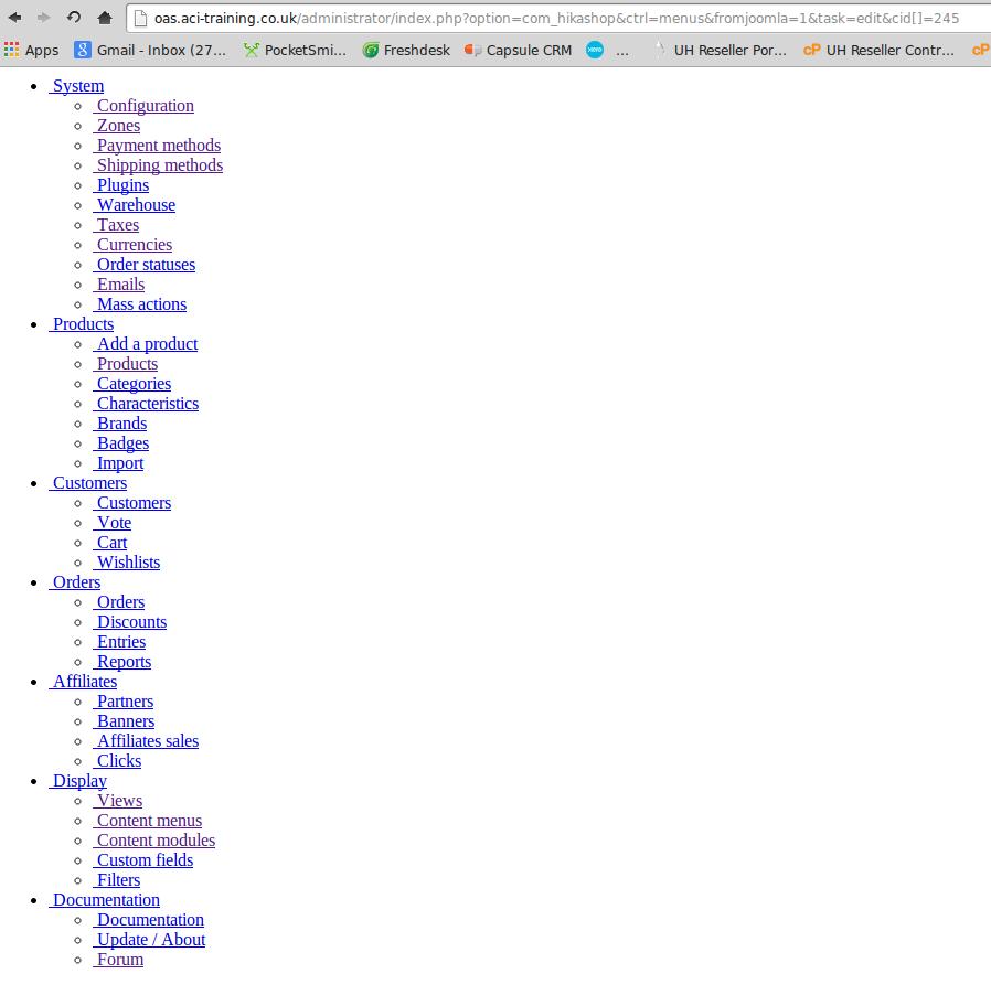 Fresh installation of Joomla and HikaShop. Products added successfully (via Joomdle). When I try to create a Menu option to list the products in a category, and click on "HikaShop Options", I don't get the normal options page. Instead, I get a listing of all the options in HikaShop, without any formatting/CSS/menus (screenshot attached). This means that I cannot select or configure the menu I want, and therefore cannot display the products in a menu (which is required for this website).