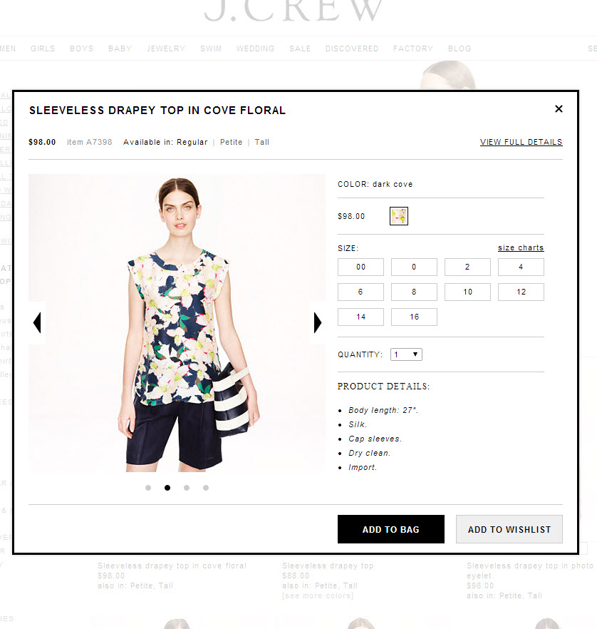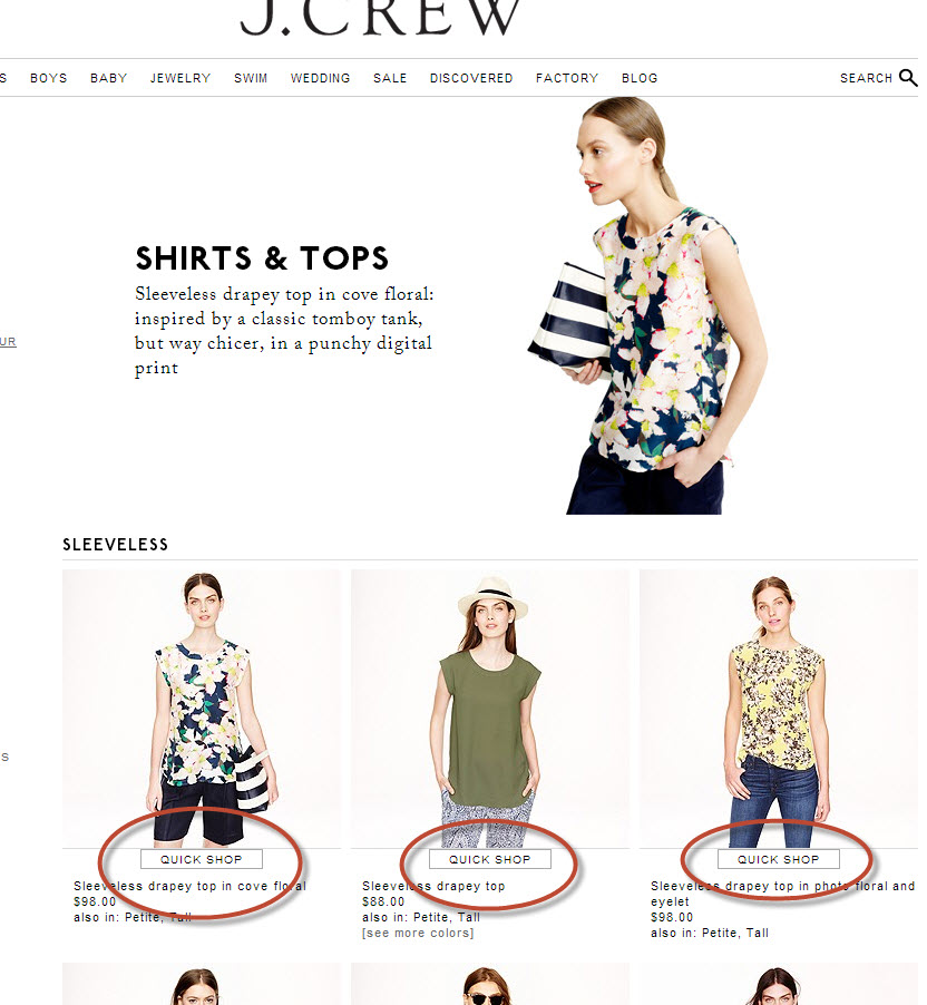 In the JCrew example, instead of "Choose Options" it displays the wording "Quickshop" and when clicked it opens a modal window with the product view in it.