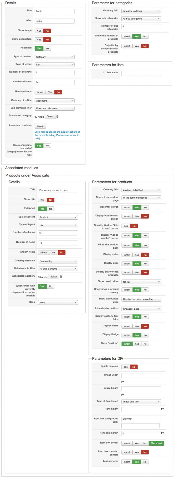 Just FYI, there's only one menu calling all products across all main categories (and no comparing wanted/needed), for the rest I'm staying within the main categories, so that a limitation to 2 levels is not a problem, and we here can focus on one of my main categories (named "Audio") - the other 3 are set up identically except for the associated category they're pulling from.