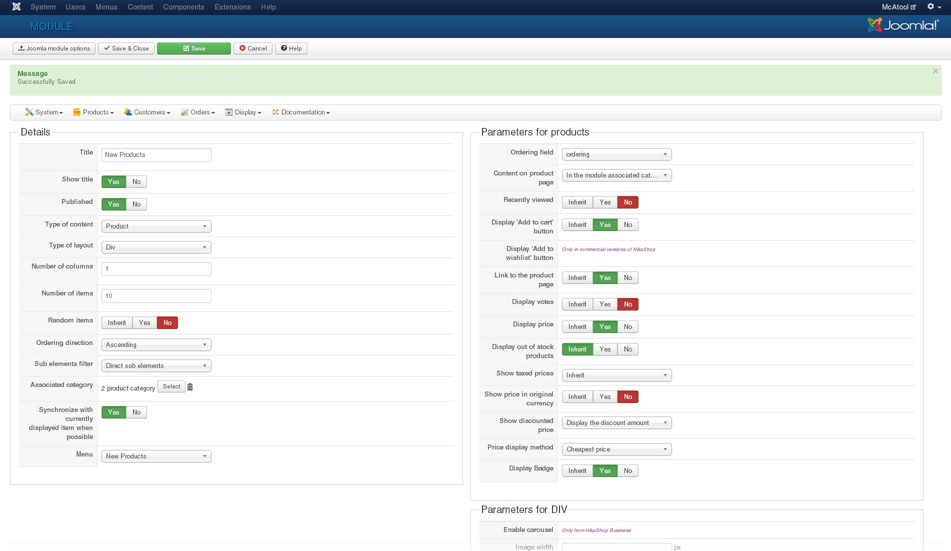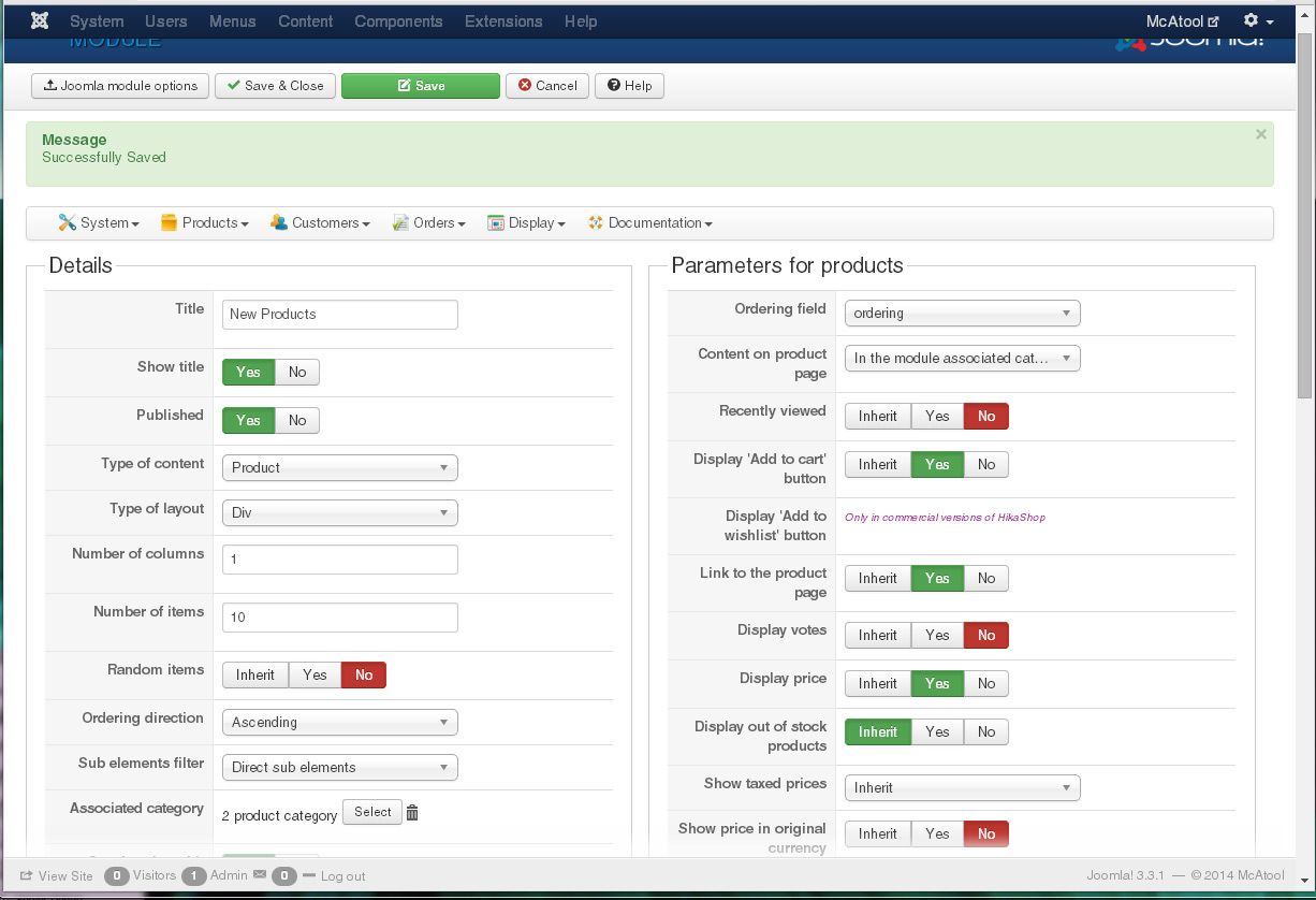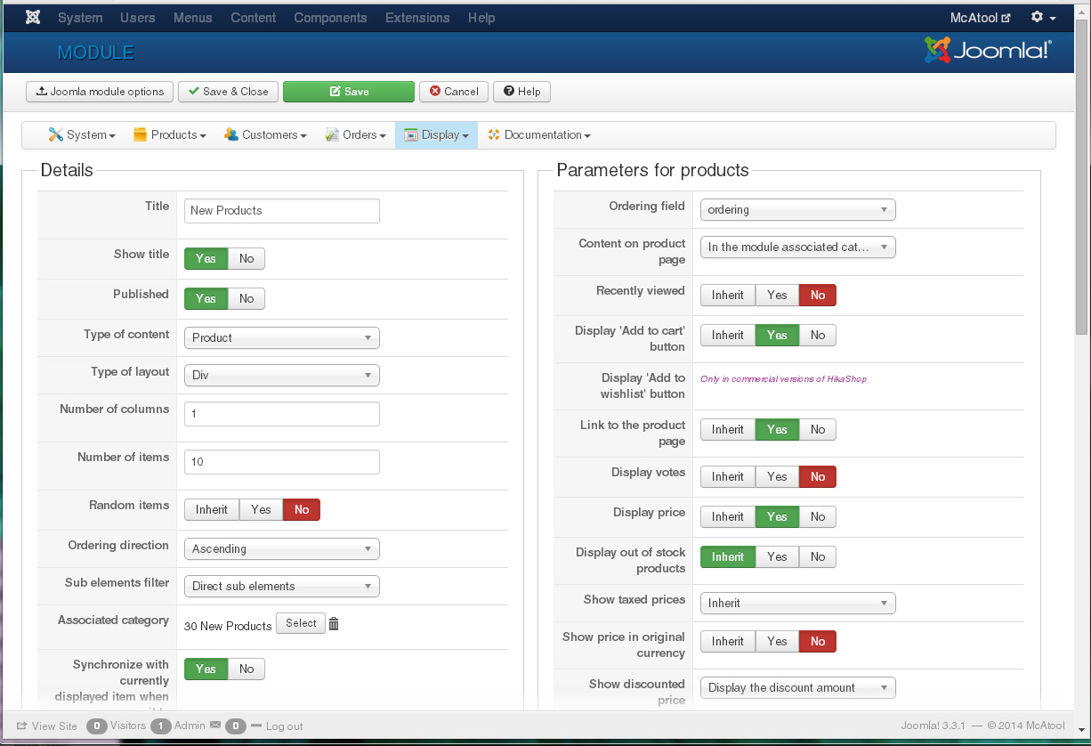 SET `module`='mod_hikashop',`title`='New Products',`showtitle`='1',`published`='1'