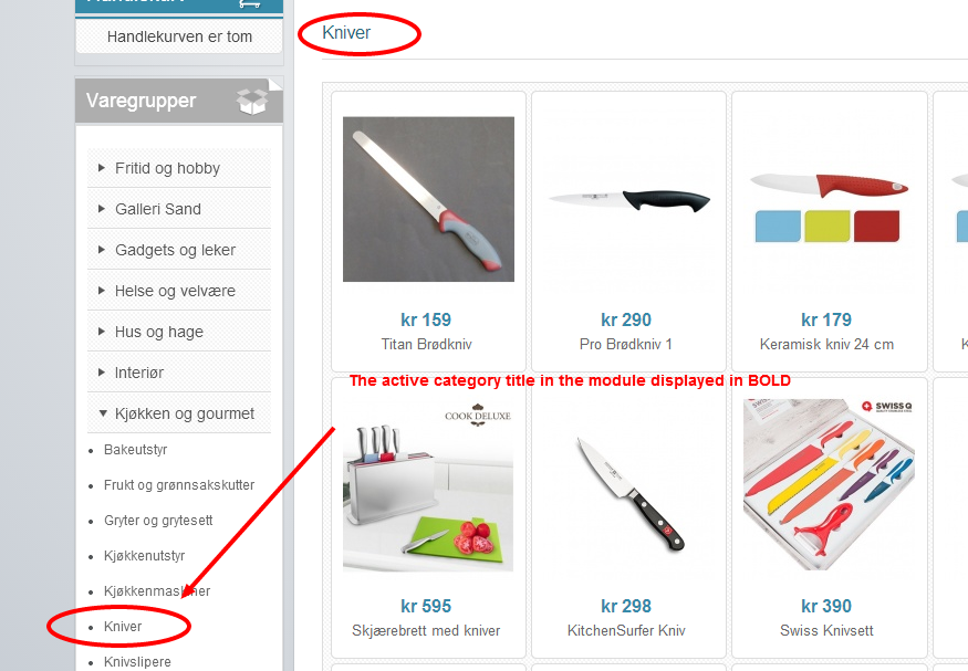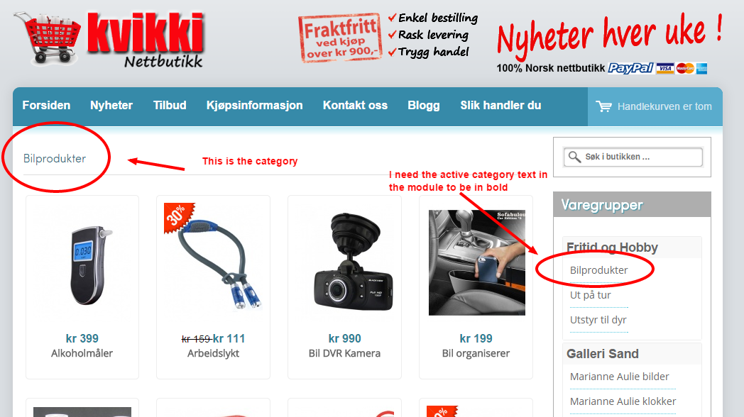 But when a user clicks on a category i.e "bilprodukter/car products" I want it to be dispayed in bold(the active category), so that the user remember what category he clicked.
