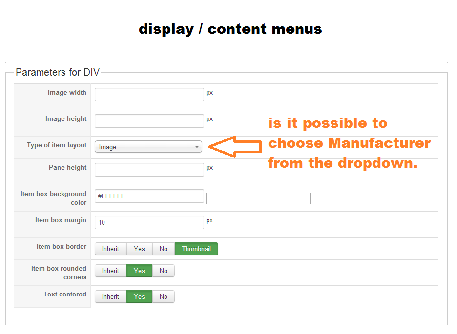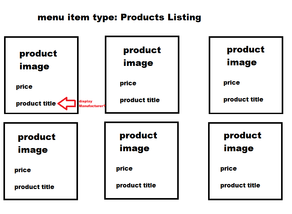 In display / content menus --> type of item layout - I would like to choose Manufacturer to display underneat the product image. Is this possible? For some screenshots see the attachments.