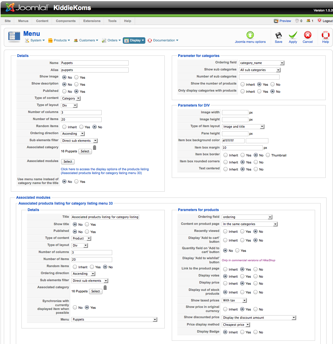 I'm sorry, but I don't understand your instructions. Going to Display/Content modules gives me a list of a few hundred items. And each item leads to source code. I don't have plans to make changes to source code. Though, I had a look at a few entries and could not find 'menu', and certainly no property to set the Hikashop menu.