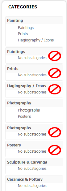 On the left side, I am trying to create a list of categories but it doesn't work correctly. One of the main problems is that I am getting twice the submenus of Painting, Photography & Miscellaneus artwork. Becides that, here are the settings and the issues that I am experiencing on each case of type layout: