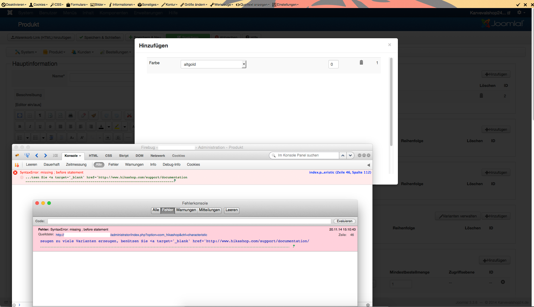 alertMessage.innerHTML = '".str_replace("'","\'",str_replace("\'","'",JText::sprintf('TOO_MANY_VARIANTS',$optionsLink,$customLink)))."';in the file administrator/components/com_hikashop/views/characteristic/view.html.php and that should fix the error even without fixing the translation file.