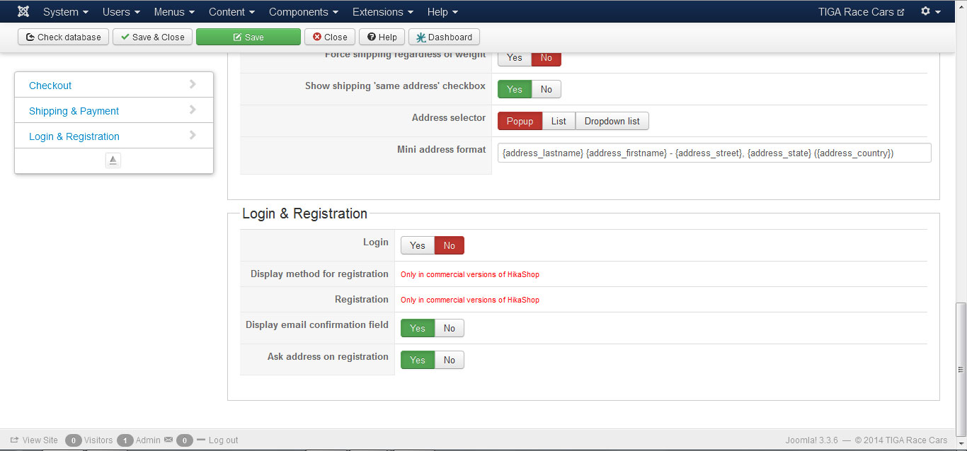 Registration : When this option is set to "guest" the fields name, username, password and password verification from the HikaShop registration form will be removed and no Joomla user account will be created for the user on the website.