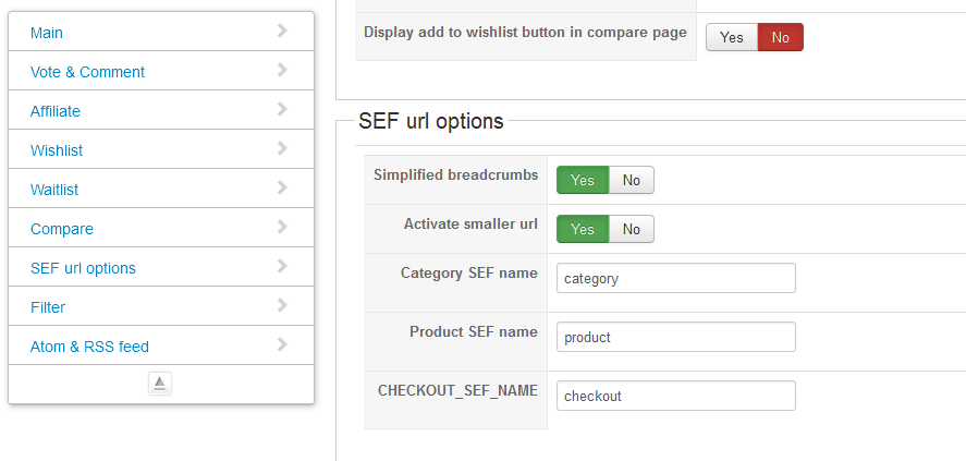 This option is under the "SEF url options" section of the Features tab of the HikaShop configuration that you can access via the menu Components->Hikashop>Configuration of your backend.