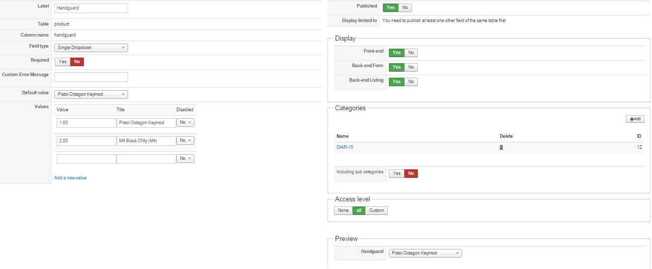 I've been playing around with Hikashop for a little while now and thought that everything would work as I needed it to. I've ran into a snag though and need some advice. My client is selling products that have 7-10 categories of options for each product and then anywhere from 2-7 items in each category. So for instance I have the following: