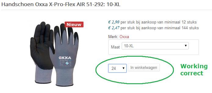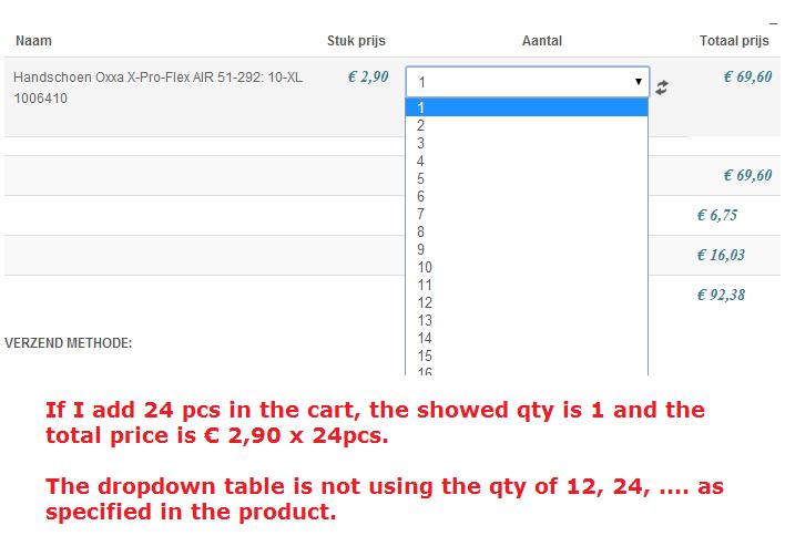 If I add 24 pcs in the cart; the quantity in the checkout shows 1. However the orderline value is correct (24 pcs * € 2,90).