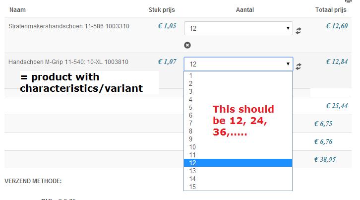 In the checkout, the dropdown table is (1,2,3,4,......) but this should be using the minimum of 12 to have a dropdown table of 12, 24, 36,..