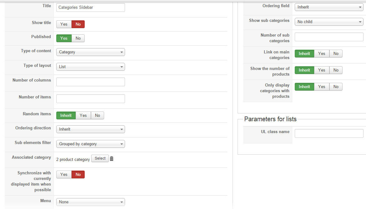 With the module (Categories Sidebar) in my template's left position and the Categories Listing menu item in the position next to it. However I can't seem to figure out where to change the position of the Categories Listing menu item, and I assume that is why the Categories Sidebar module is not displaying to the left despite being set to the left.