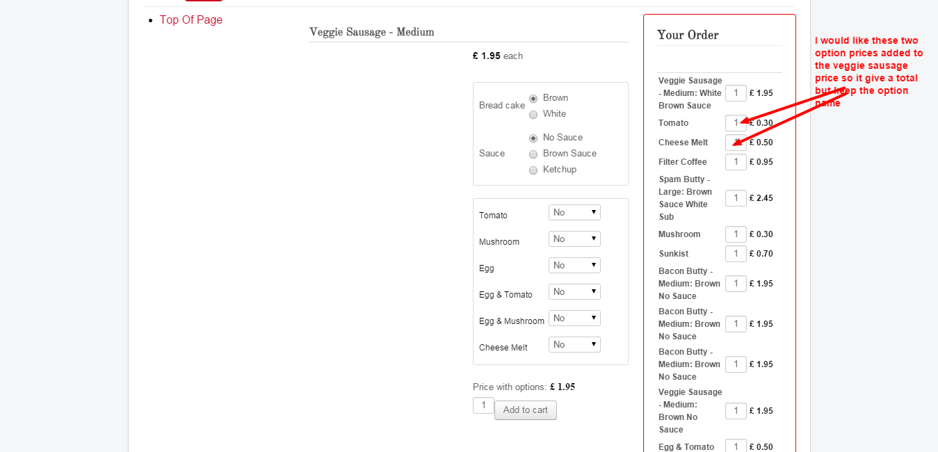 For example if you order a bacon butty with egg you get bacon butty - 1.95 egg -0.50 in the cart listing. I just want bacon butty - egg -2.45 - to make it easier to read. I have attached a screenshot of how I would like it.