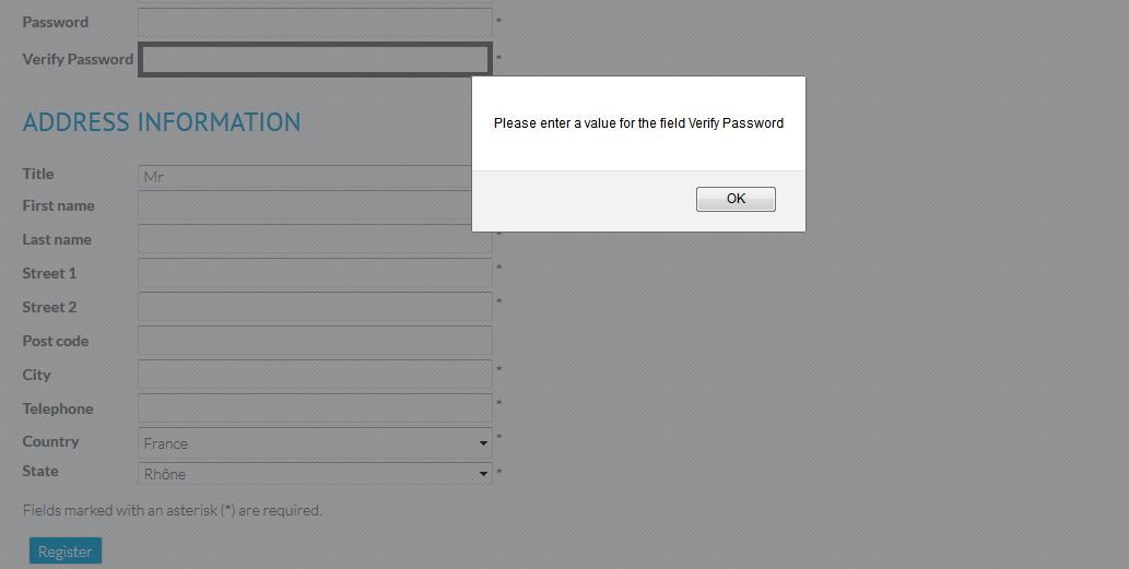 I am attaching a screenshot. I have clicked on Register button below, it marks "Verify Password" field with gray border and shows an alert, but most fields are mandatory.