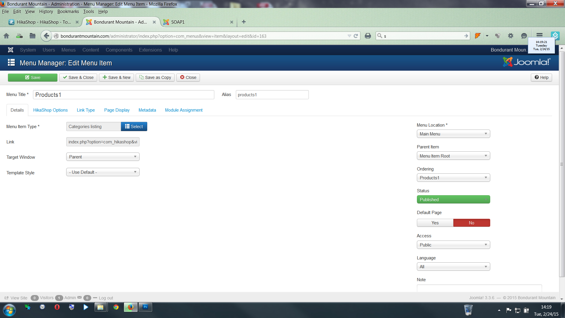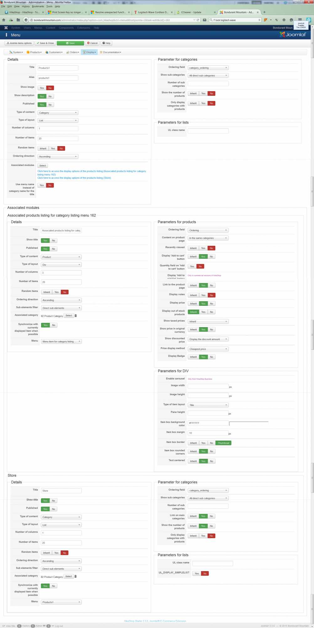 Could you do a screenshot of the menu item settings page of the "products1" menu item when editing it from the Joomla menu manager and from the menu Display>Content menus of HikaShop ?