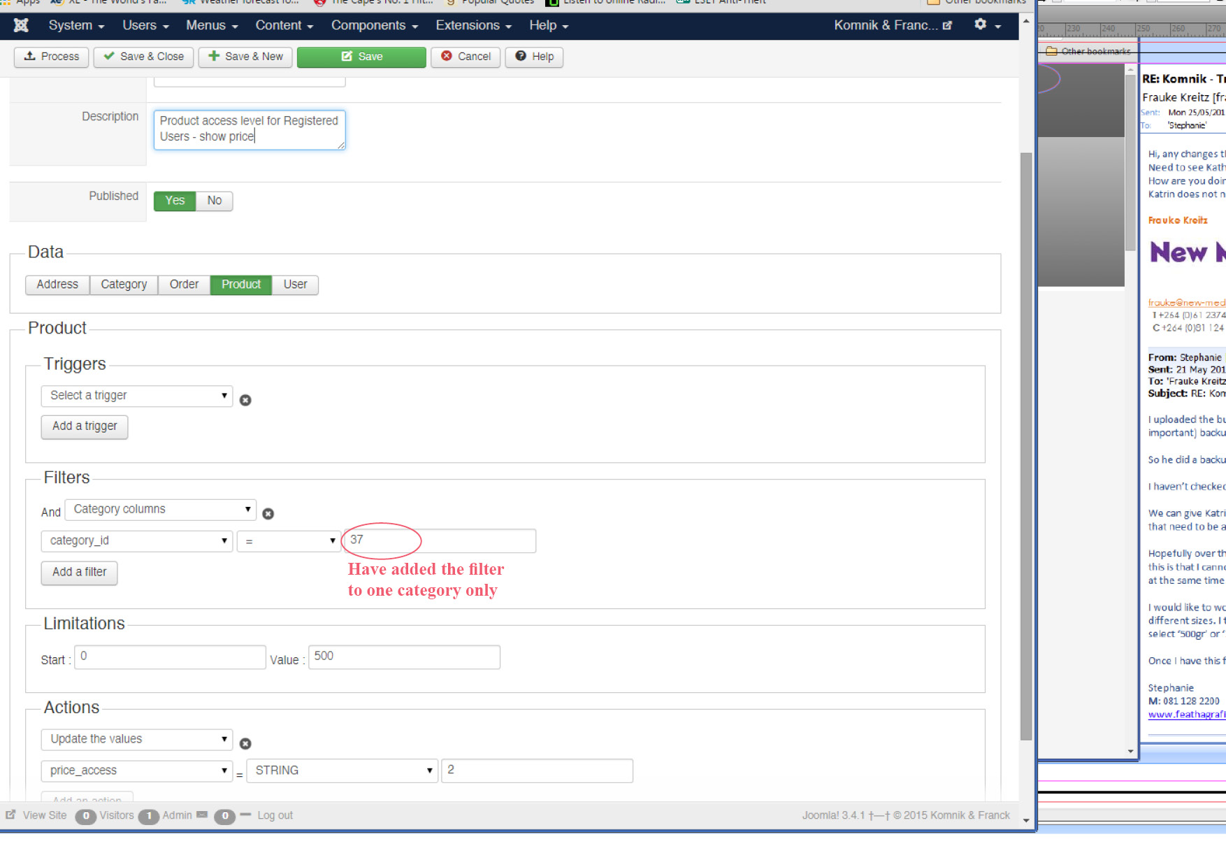 2. You can do that with a mass action that you can create via the menu System>Mass actions with an action "update the values on the price_access column with the same data as you have in the price_access column of the hikashop_price table of your database for the price of the product that you already configured.