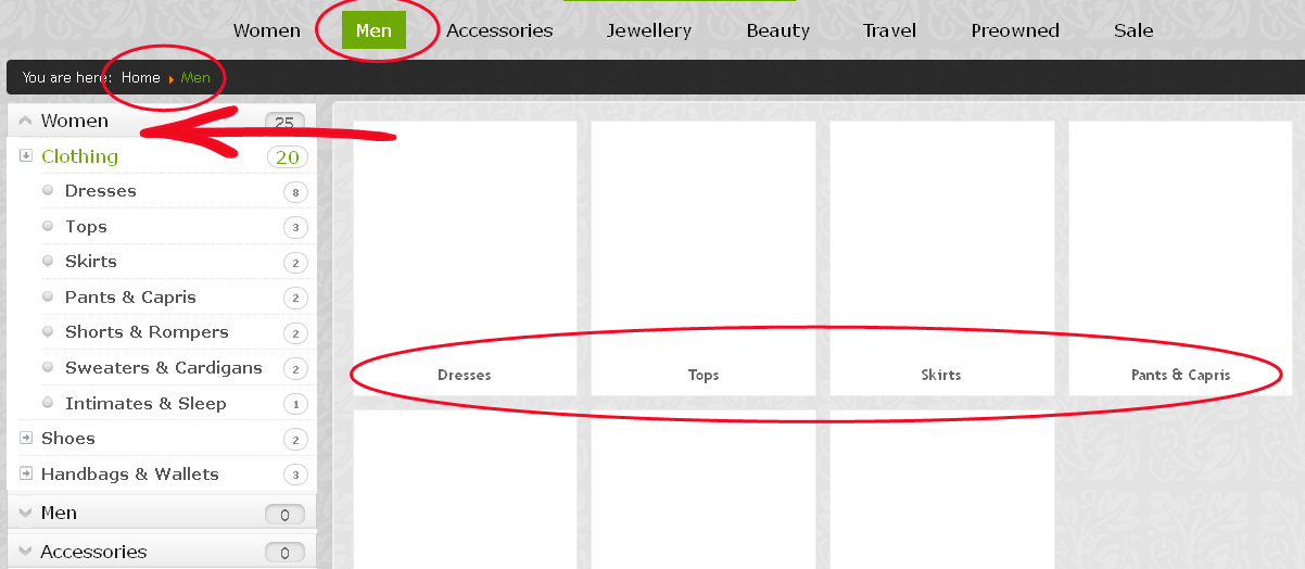This one I see no change - it is still defaulting to the women's category as indicated above. It seems to only do this whenever the sub-categories have the same name. It does this to the "Clothing" and "Shoes" sub-categories when you click on them in the MEN's menu they default to the WOMEN's menu.