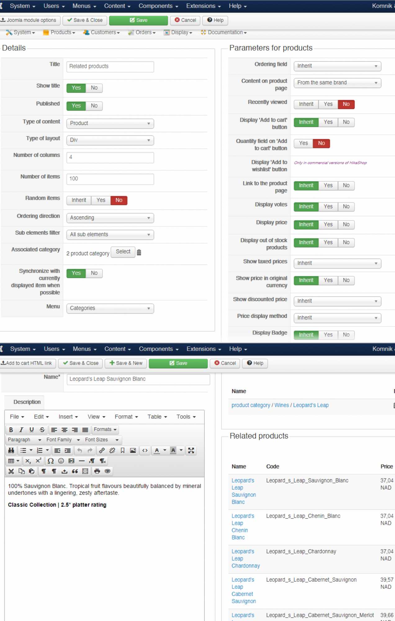 2. In the HikaShop options of the module (there is a link to them on the right of the module's joomla options screen), make sure that the "Type of content" option is set to "product" and that the option "Content on product page" is set to "Related products".