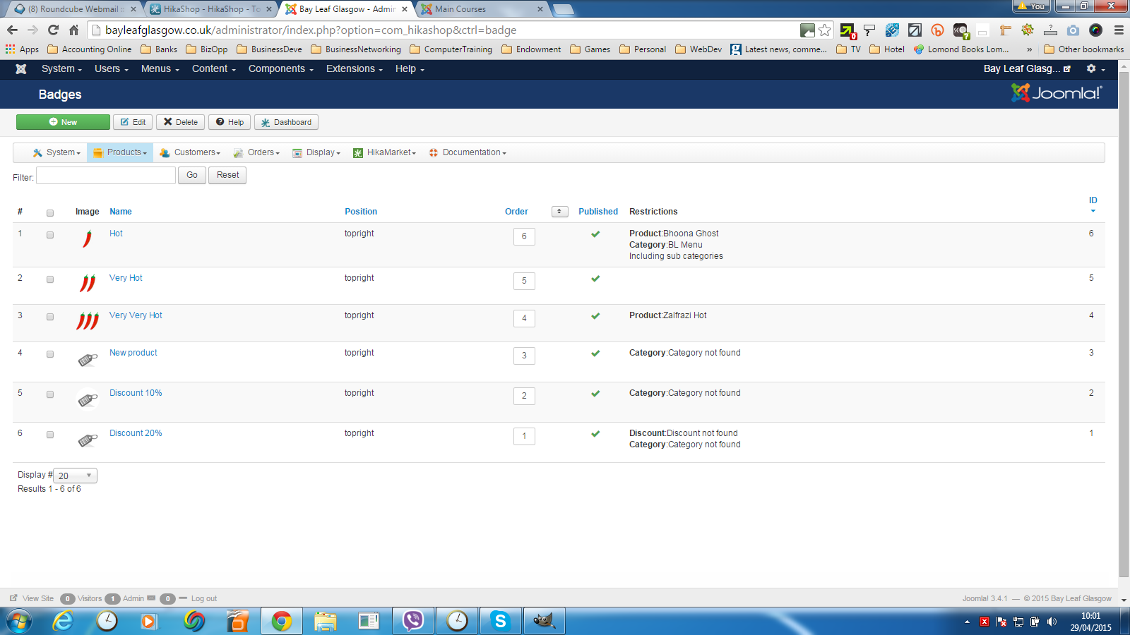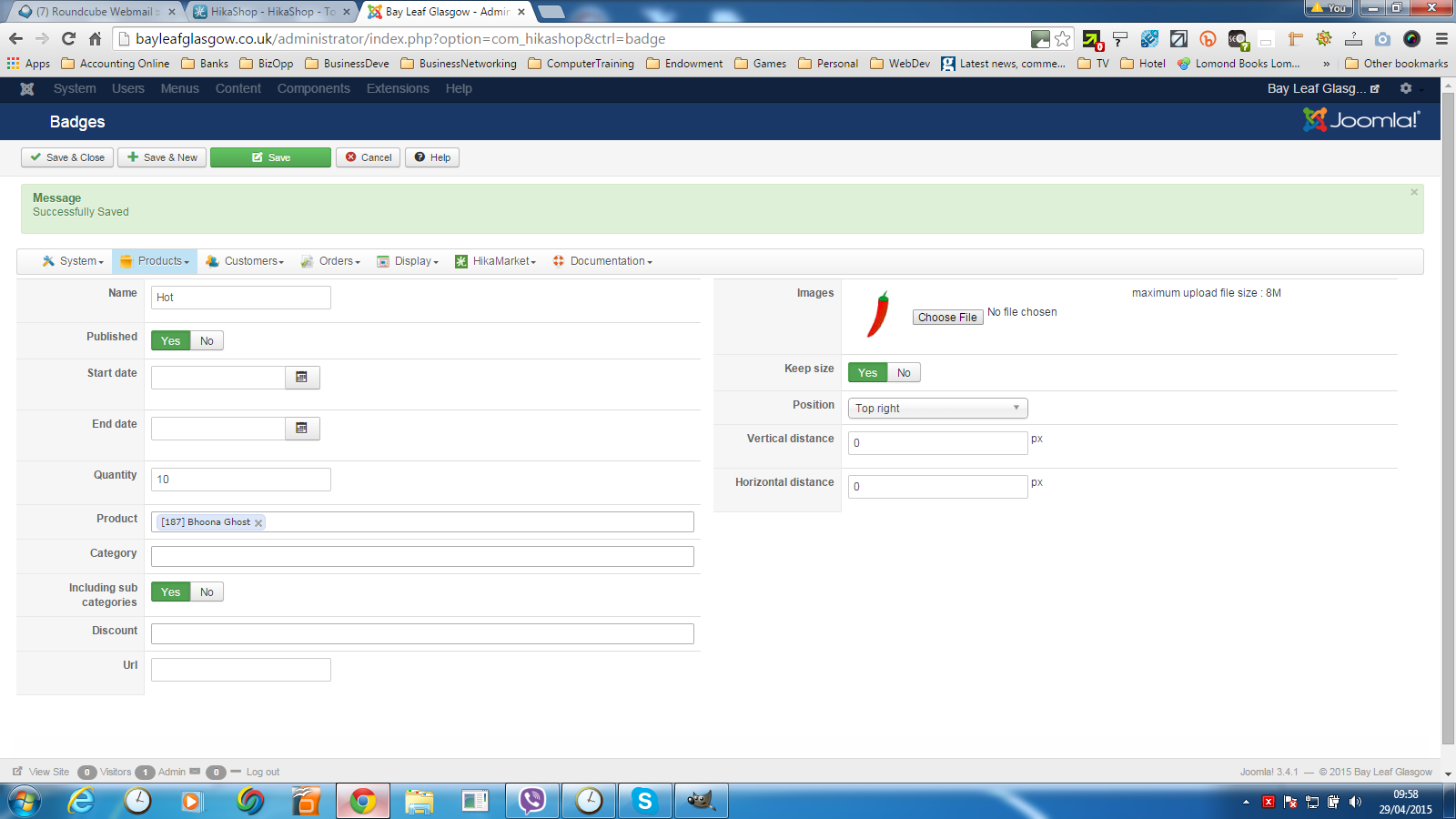 The issue with the category not saved in the badge comes from a bug. Download the latest version of HikaShop and install it on your website and it will add the patch that we added recently to correct that.
