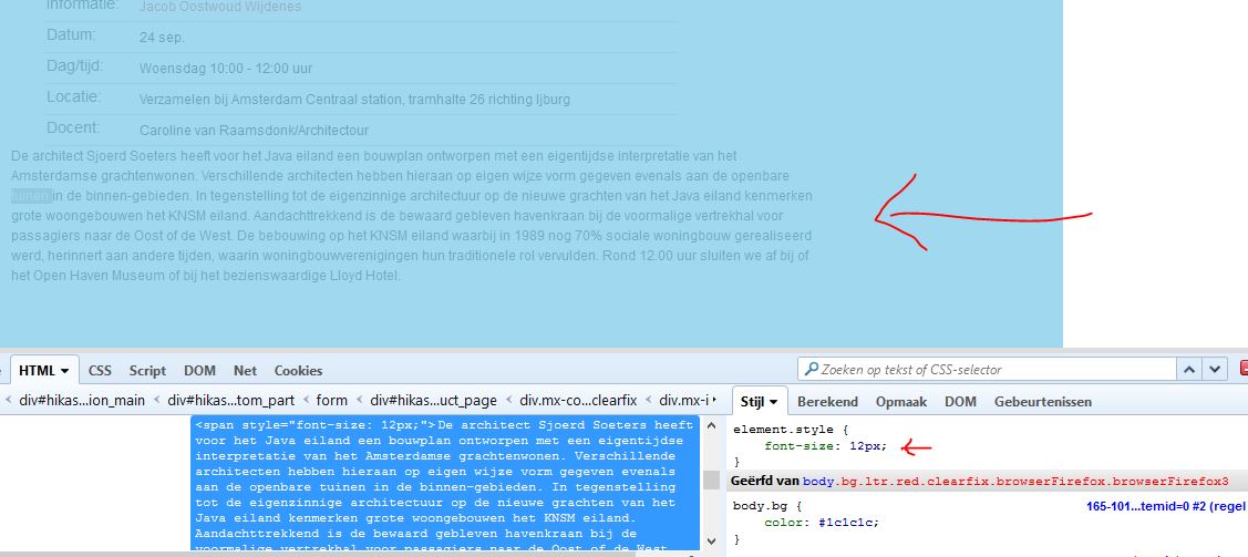 Because the "span" which set the fond-size to 12px has been added by "yourself" in the product description ; I think that your WYSIWYG editor should have add it, but it's not related to any code in HikaShop. You just need to modify the product description content.