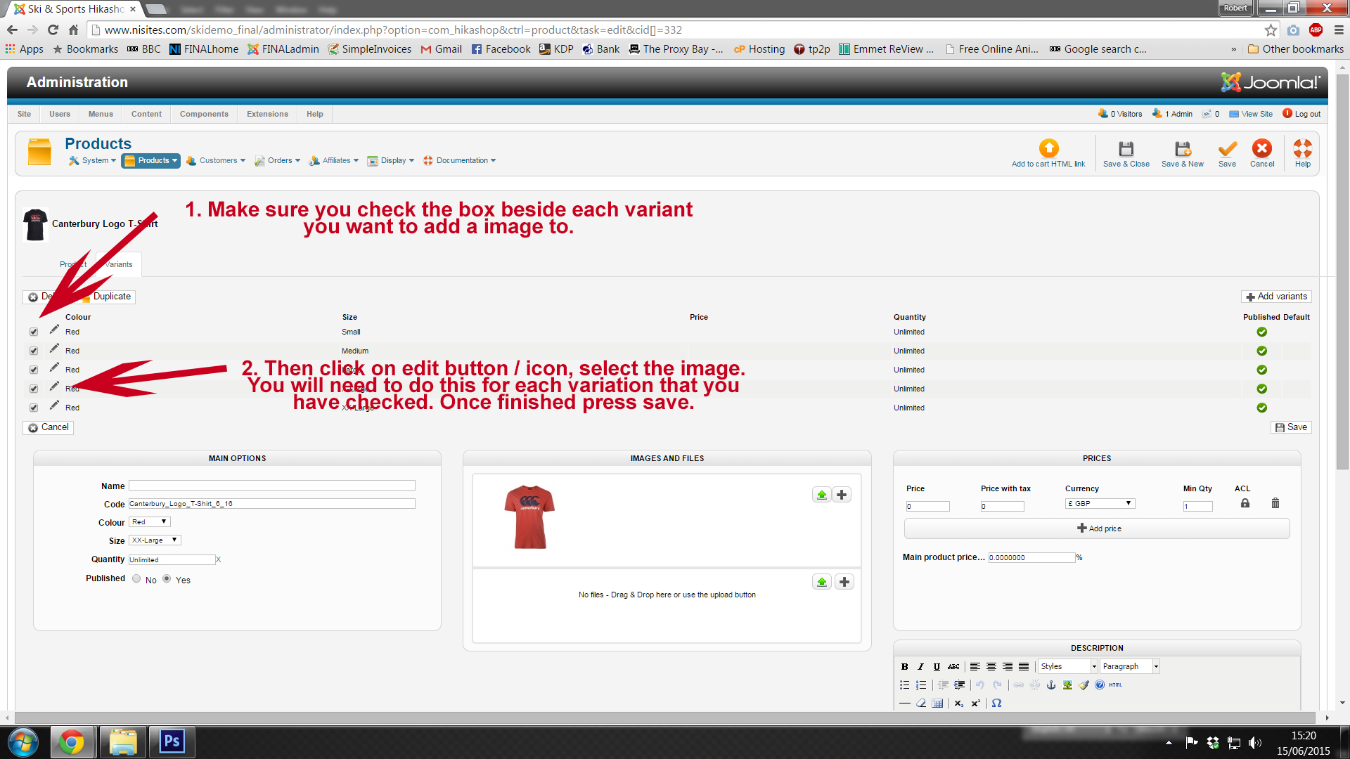 Once the images for each colour has been set I would then add the size Characteristics which then automatically created 5 sizes for each colour. So if for example I looked at the large red t-shirt it would show a image of a red t-shirt and this would be the same for each size of the red t-shirt and vice versa for the black. I didn't have to go into each size and add a image as each size for the black colour already had the correct image and the same for each size in the red colour.