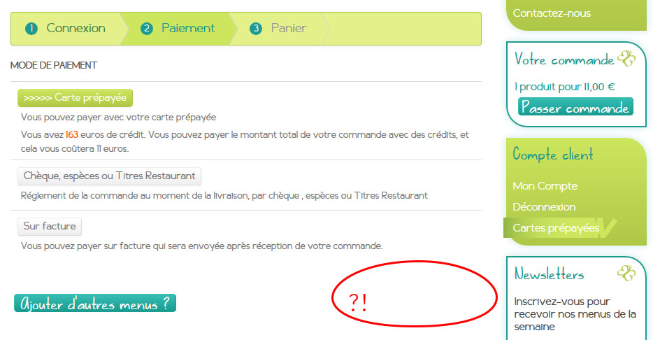 Par contre, si j'ai dans mon panier un "plateau repas" - qui est un produit gratuit mais avec des options payantes - au moment du paiement, j'ai bien le choix entre les différents moyens de paiement, mais je n'ai plus le bouton "suivant" et je n'ai plus le bouton "valider ma commande" sur l'étape finale...
