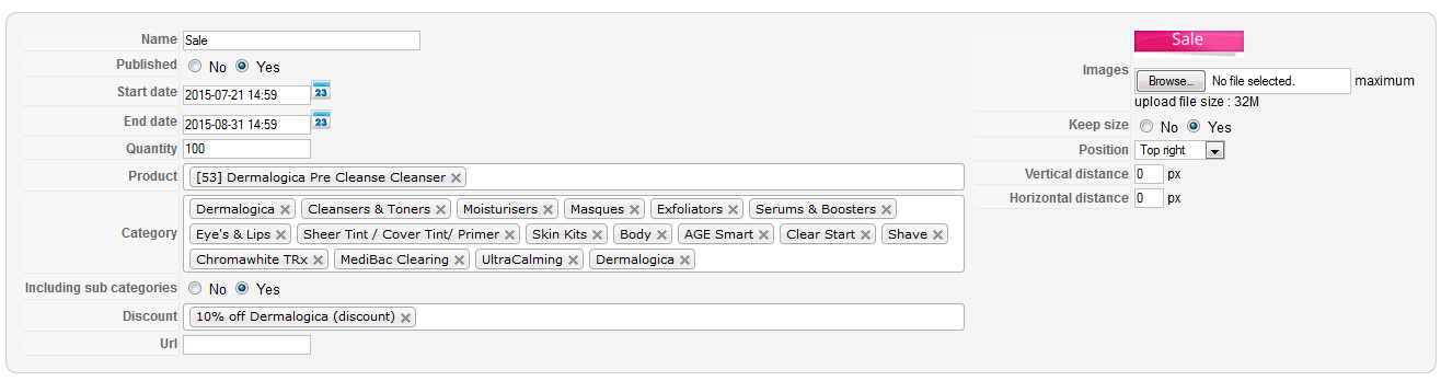 Regarding these settings, the badge should be displayed only on the product "Dermatologica Pre Cleanse Cleanser" if this product is in one of the categories selected under and if these categories are selected in the discount "10% off Dermatologica".