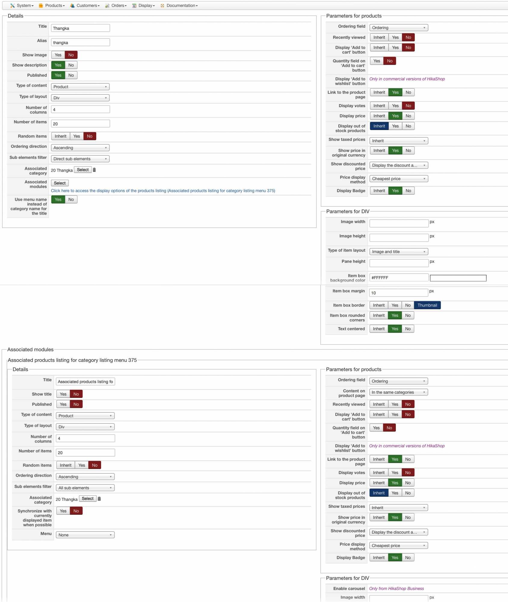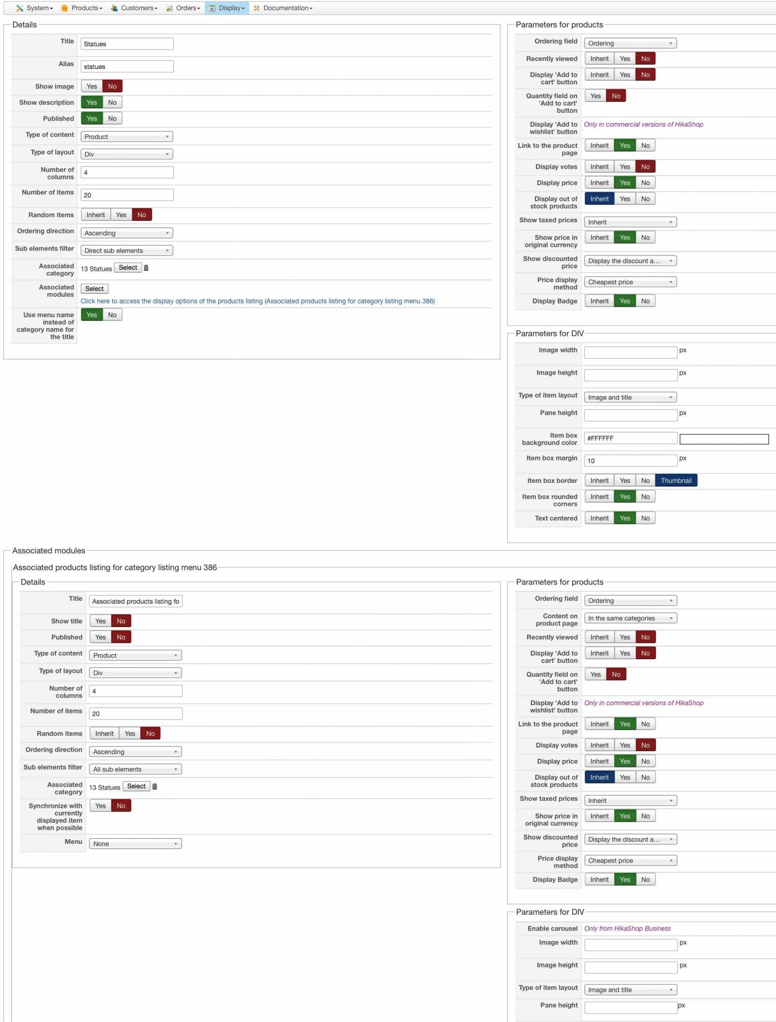 The Statues and Thangka menus are setup as Hikashop - Product Listing with same options:
