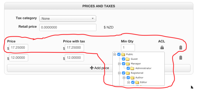 When someone who is in the ACL group RESELLER logs in to the front end the price on the products is now shown as "FREE". The RESELLER price is not shown and there is a check box where the pricing should be.