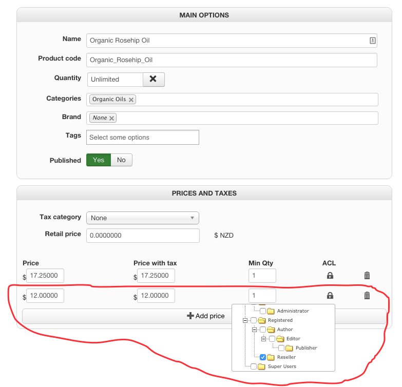 I have set up an ACL group called RESELLER and have also added in special pricing on each product. In the ACL list for that pricing only the RESELLER group is selected.