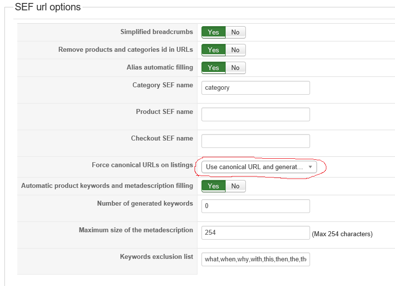 Then, make sure that the "force canonical URLs on listings" setting of the HikaShop configuration is turned on and the system will use that link when necessary.