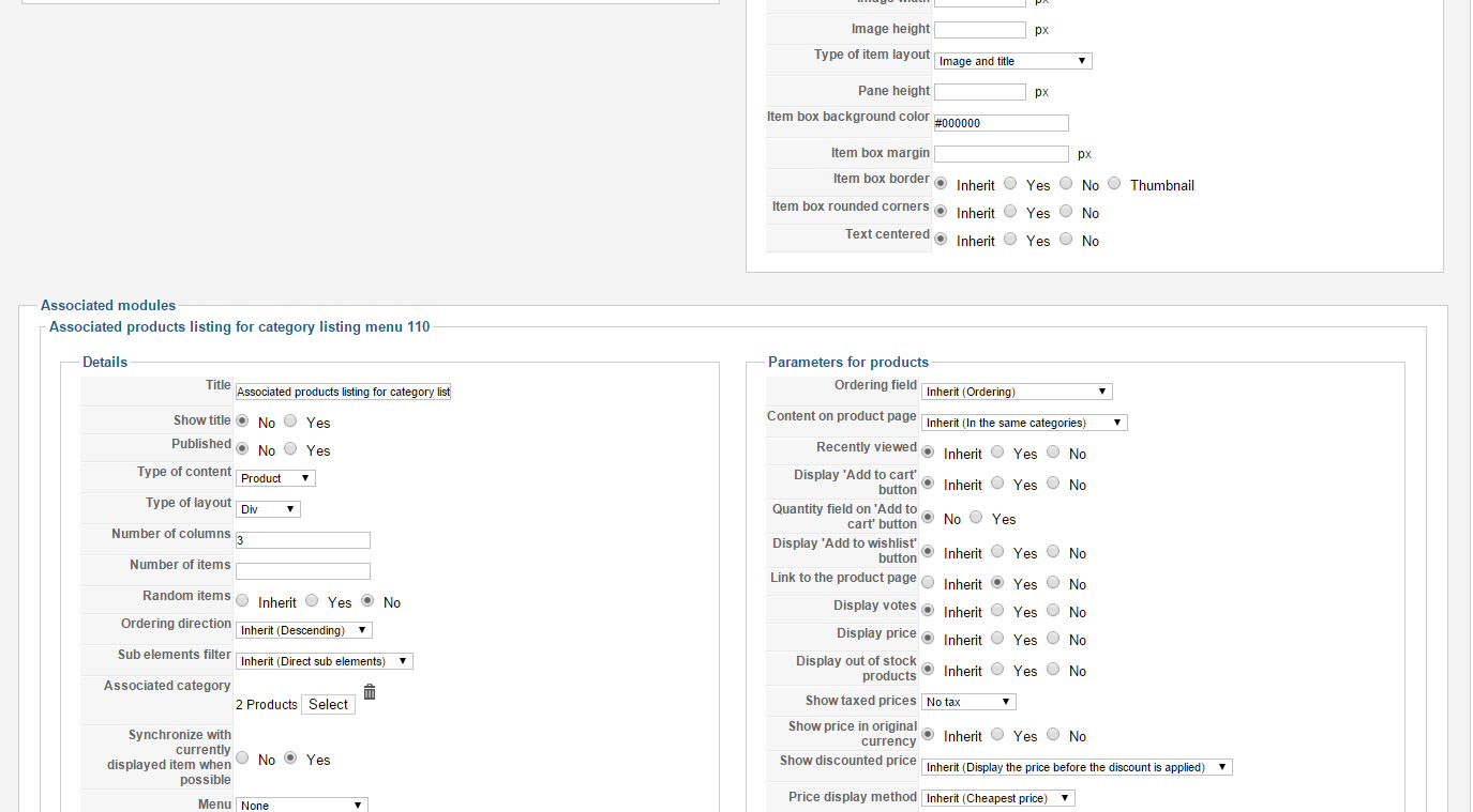 When you edit the settings of your menu via the Joomla menu manager, you have two tabs for the HikaShop options. One tab for the categories listing and one tab for the products listing.