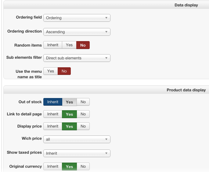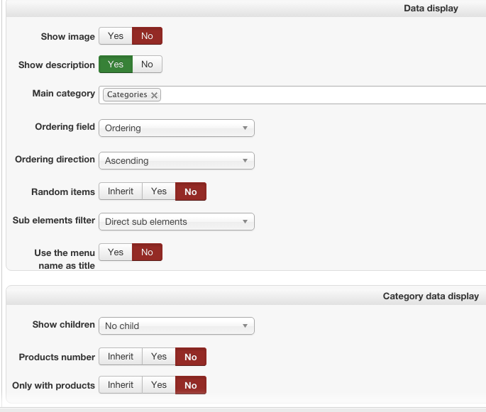 Please give us screenshots of the settings under the "Categories Options" and "Products Options".