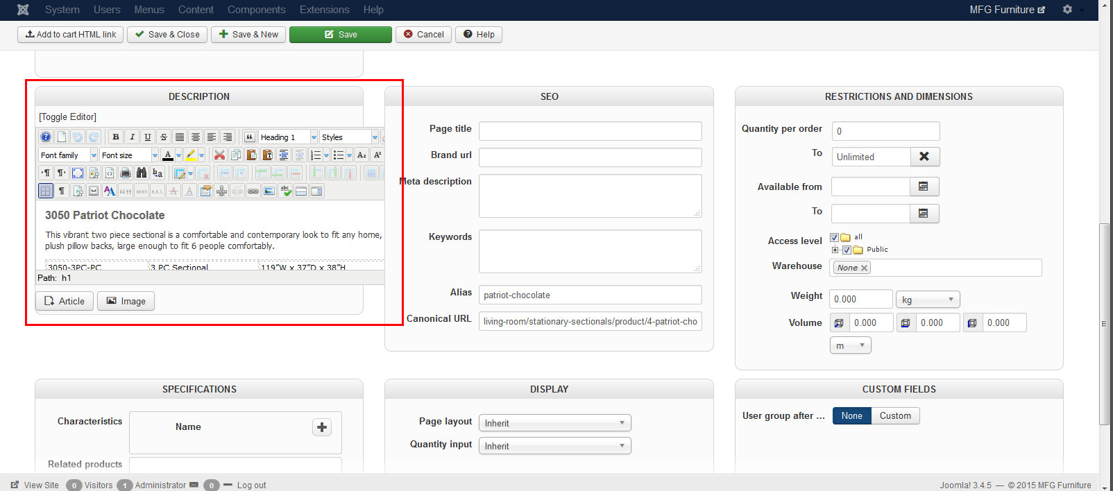 The WYSIWYG editor is cut off in the Administrator area of the product edit screen.